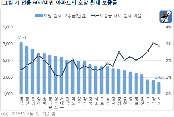 ¼ÒÇü ¾ÆÆÄÆ®ÀÇ º¸Áõ±Ý ´ëºñ ¿ù¼¼ ºñÀ²Àº ¼¿ï Àüü Æò±Õ 1.9%´Ù. Áö¿ªº°·Î´Â °³²±¸°¡ 3.0%·Î °¡Àå ³ô°Ô ³ªÅ¸³µ´Ù. ÀÌ Áö¿ªÀº º¸Áõ±ÝÀ» ³·Ãß°í ¿ù¼¼ ºñÁßÀ» ³ôÀÎ ÀÓ´ëÂ÷ °Å·¡°¡ »ó´ëÀûÀ¸·Î ¸¹´Ù´Â Àǹ̴Ù. º¸Áõ±ÝÀÌ ³ô°í ¿ù¼¼ ºñÁßÀÌ ³·Àº Áö¿ªÀº ¿µµîÆ÷±¸¿Í ¼´ë¹®±¸·Î º¸Áõ±Ý ´ëºñ ¿ù¼¼ ºñÀ²ÀÌ °¢°¢ 1.1%¿¡ ±×Ä¡¸é¼ °¡Àå ³·Àº ¼öÁØÀ» º¸¿´´Ù.